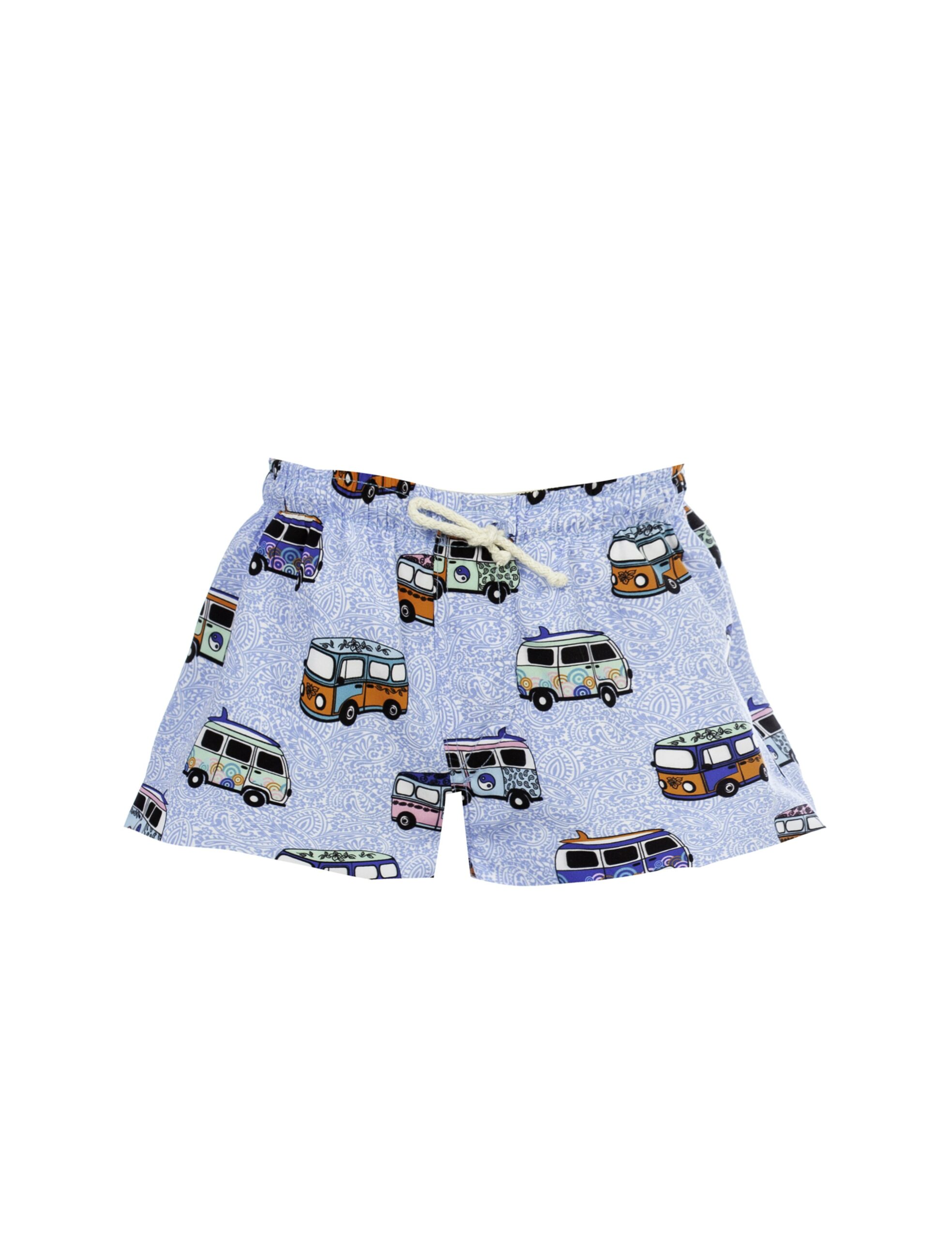 Boy’s pale blue swim shorts, with a branded pocket on the back. Soft, silky and lightweight, the woven fabric is stamped with psychedelic paisley prints and ’60s camper vans. To ensure the best fit, the waist is adjustable with an ivory rope drawstring. These comfortable shorts are lined with soft and breathable cotton-blend mesh.